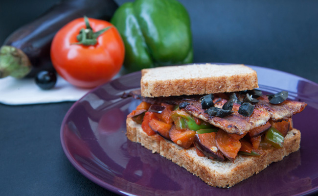 Un sandwich équilibré au pain complet, où une délicieuse ratatouille vient accompagner du bacon croustillant.